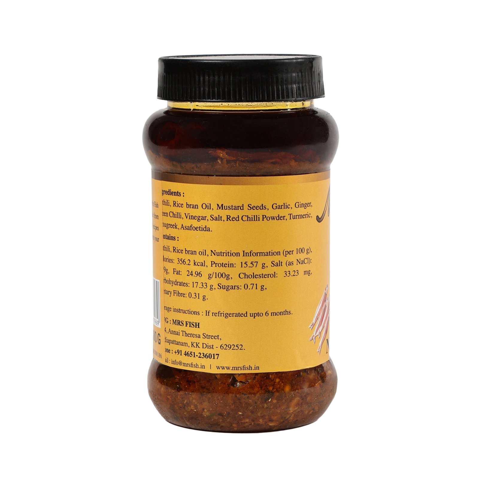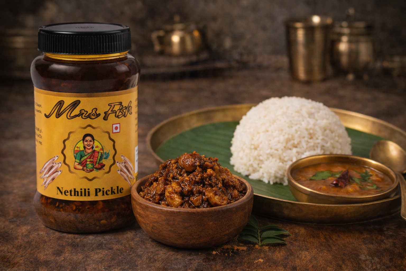 Traditional Kanyakumari style Nethili (Anchovy) fish pickle made with fresh fish, premium spices, and gingelly oil. Handmade by Mrs.Fish for a rich, spicy, and authentic coastal taste. Perfect with rice, dosa, and curd rice.