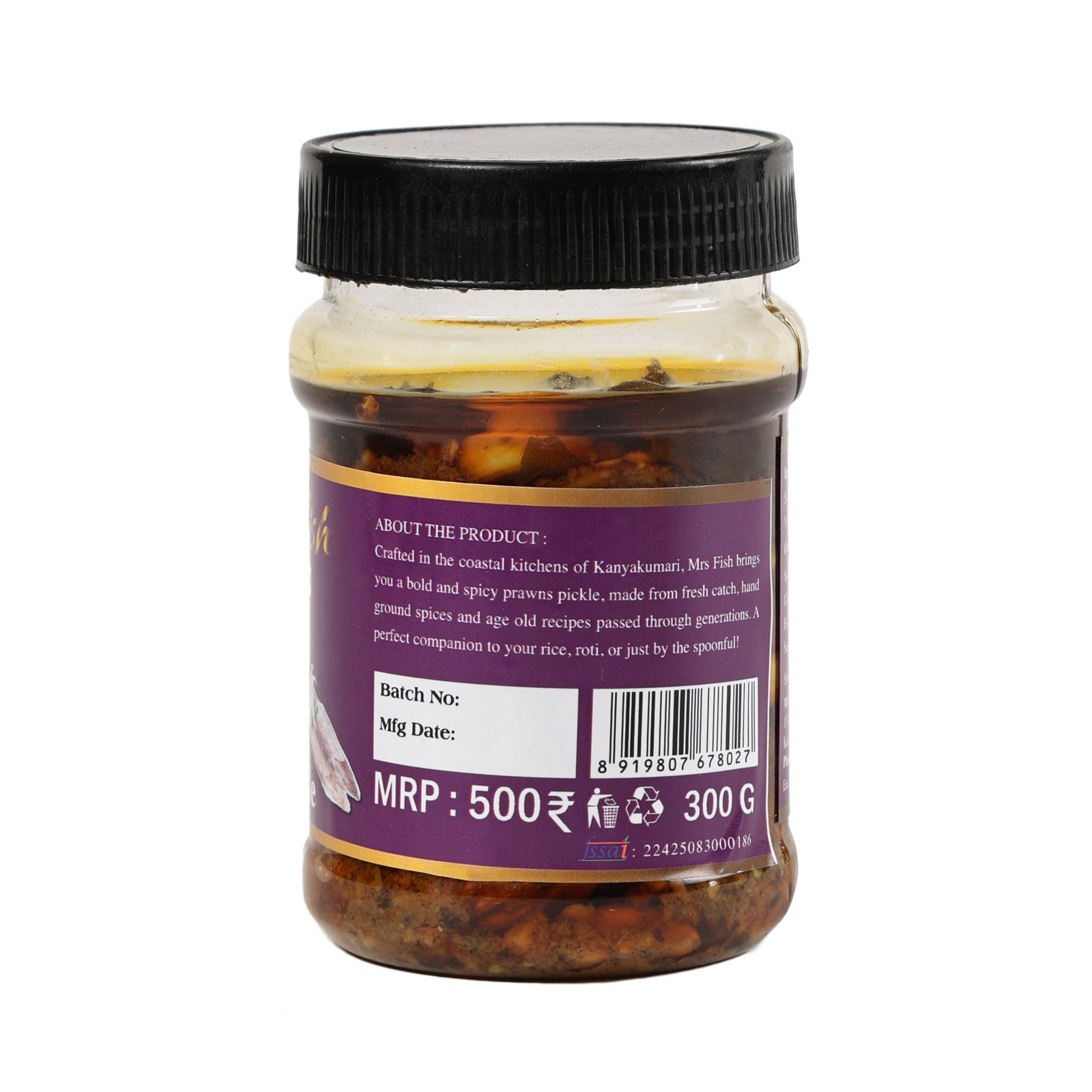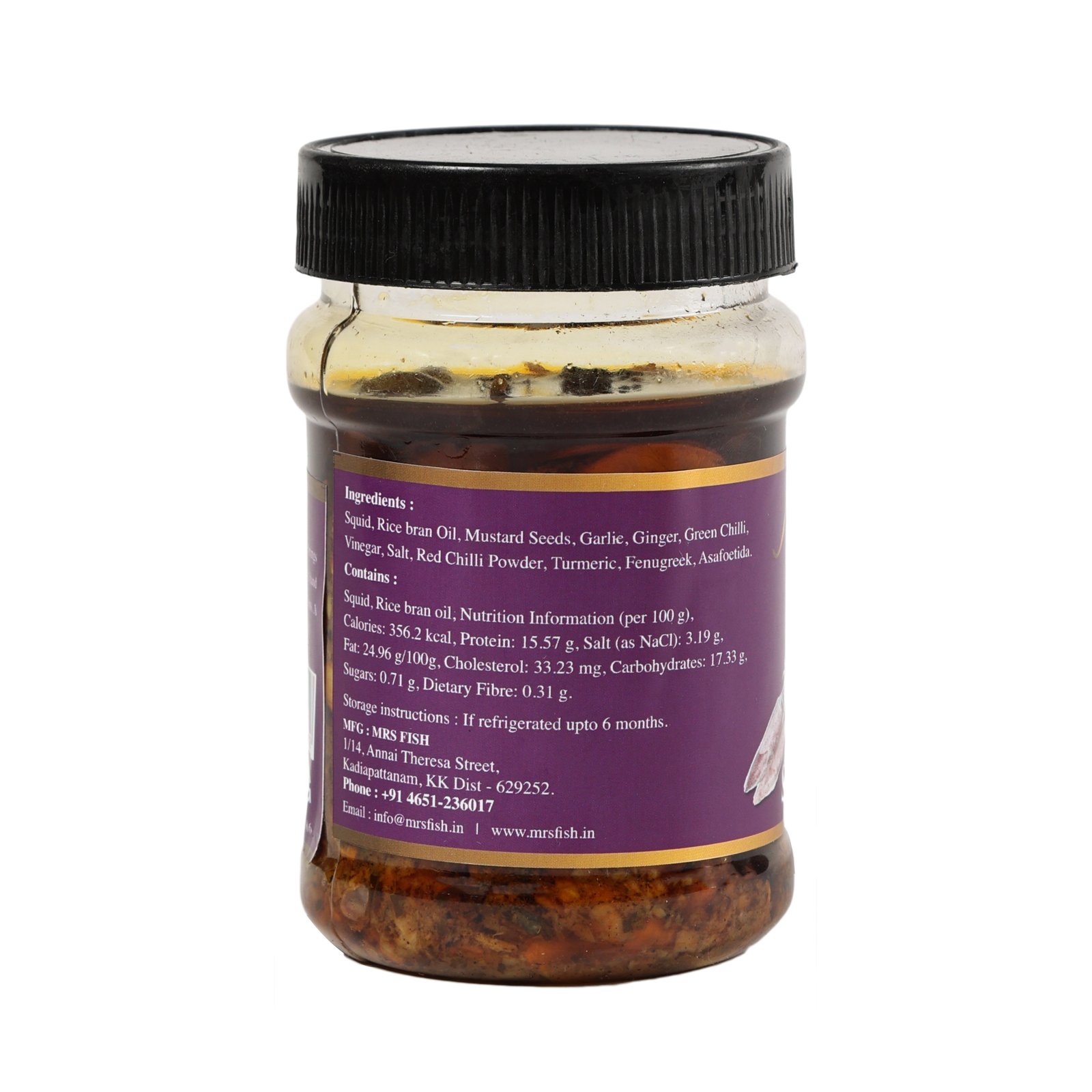 A delicious and spicy Squid Pickle (300g) made with fresh squid, traditional spices, and premium oil. Prepared in authentic Kanyakumari coastal style, this pickle from Mrs. Fish delivers rich seafood flavor and a perfect balance of spice and tanginess.